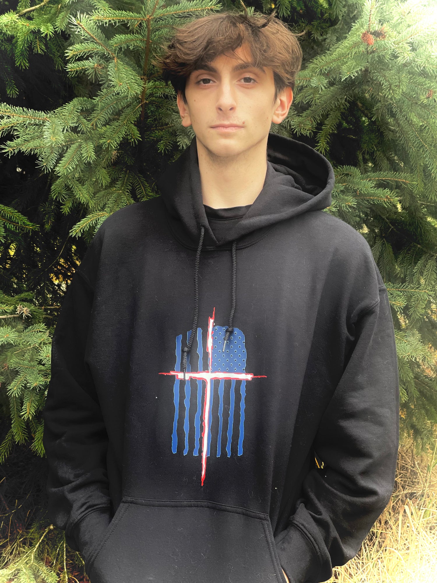 Front sided Hoodie featuring the American Flag and Cross. Check them out!